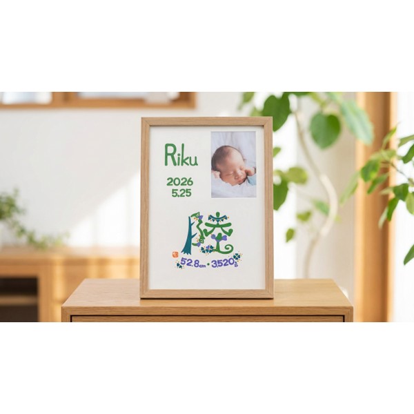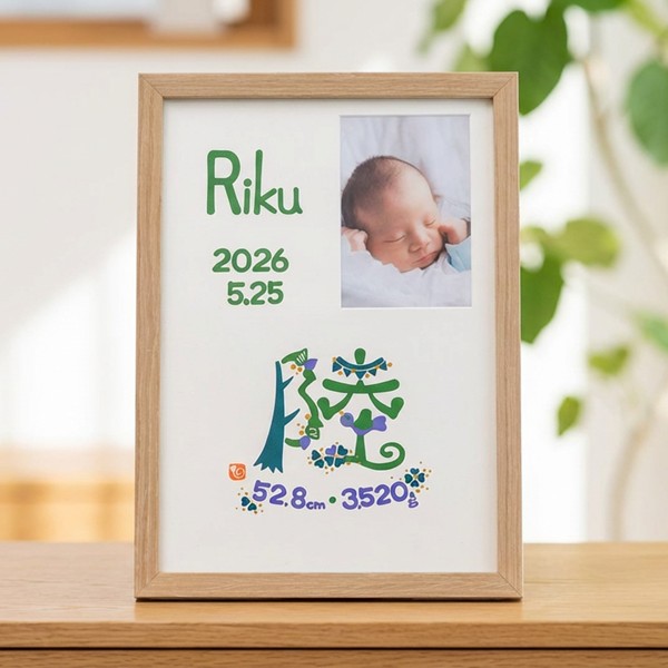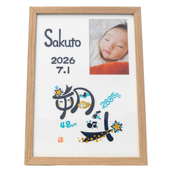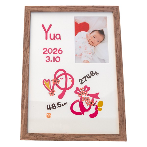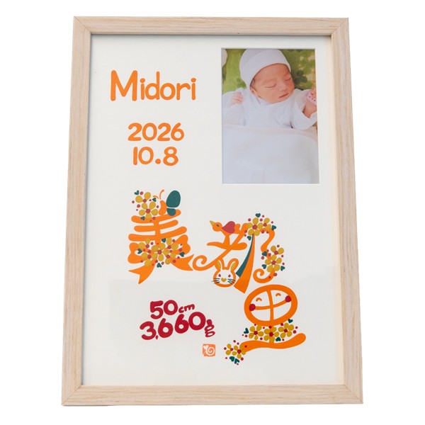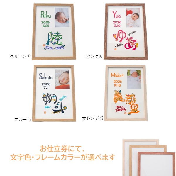 ●色タイプ:ナチュラル・ホワイト・ブラウン※お仕立券にて文字色・フレームカラーが選べます。 ●セット内容:お申込書1枚(お仕立券)・返信用封筒×1 ●商品サイズ:現品(仕上がりサイズ)約23.3×1.5×32cm・(お仕立て券封筒)約19.8×27.9cm ●材質:木製フレーム・MDF裏板・ガラス、紙、壁掛け紐 ●その他:フレーム(中国)紙(日本) ※オーダーメニューは お名前・身長・体重・生年月日 手足形は入らない商品です。文字のバランスは作家お任せとなります。 ※商品のお届けは、お仕立券からご注文をお受けして約4週間です。 ※お仕立券を紛失した場合は無効となり再発行はいたしません。