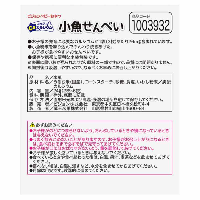 ●原材料名:うるち米(国産)、コーンスターチ、砂糖、食塩、いわし粉末/炭酸カルシウム ●内容量:24g(2枚×6袋) ※同一加工ラインで、えび、小麦を含む製品を製造しています。