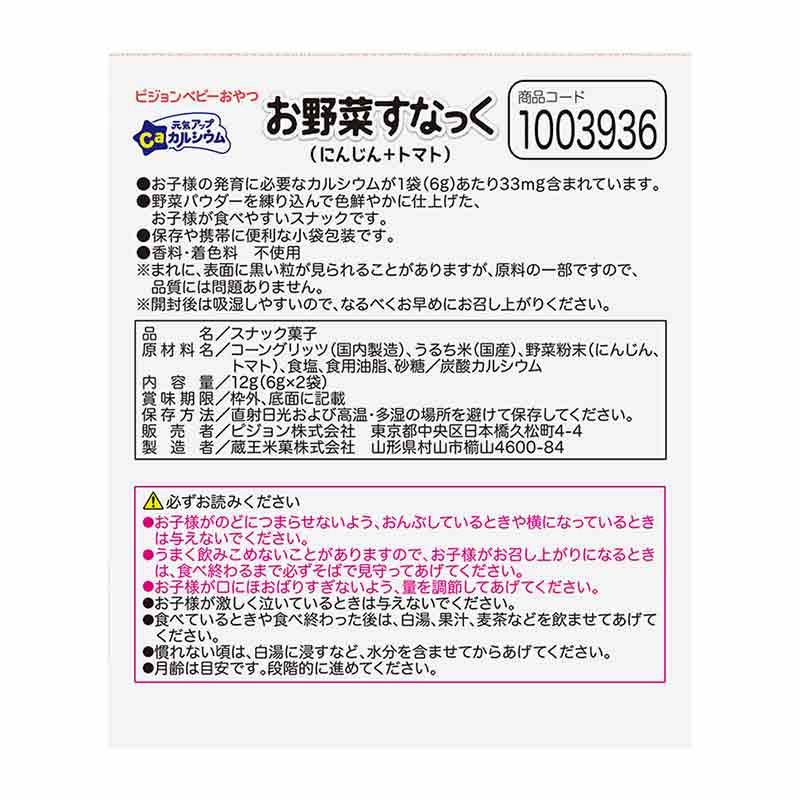 ●原材料名:コーングリッツ(国内製造)、うるち米(国産)、野菜粉末(にんじん、トマト)、食塩、食用油脂、砂糖/炭酸カルシウム ●内容量:12g(6g×2袋) ※同一加工ラインで、えび、小麦、乳を含む製品を製造しています。