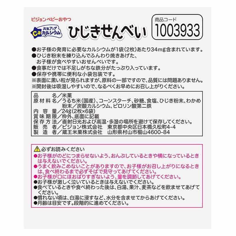 ●原材料名:うるち米(国産)、コーンスターチ、砂糖、食塩、ひじき粉末、わかめ粉末/炭酸カルシウム、ピロリン酸第二鉄 ●内容量:24g(2枚×6袋) ※同一加工ラインで、えび、小麦を含む製品を製造しています。