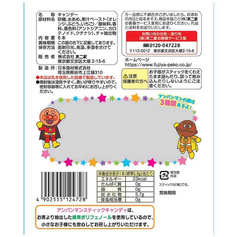 ●キャンデー ●原材料名:砂糖、水あめ、果汁ペースト(オレンジ、ぶどう、いちご)/ 酸味料、香料、着色料(アントシアニン、カロテノイド、クチナシ)、チャ抽出物 ●内容量:6本 ●栄養成分:1本(標準5.8g)当たり 熱量 23kcal たんぱく質 0g 脂質 0g 炭水化物 5.7g 食塩相当量 0g