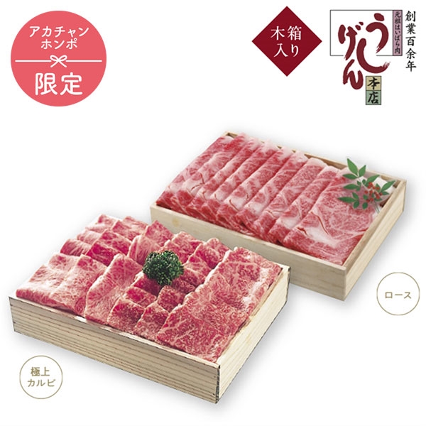 適度な霜降りで赤身が甘いカルビと美しい霜降りのすき焼き用ロースが木箱に入った豪華2段重 ※こちらの商品は、簡易包装での対応となります。 ※手付袋はお付けできません。