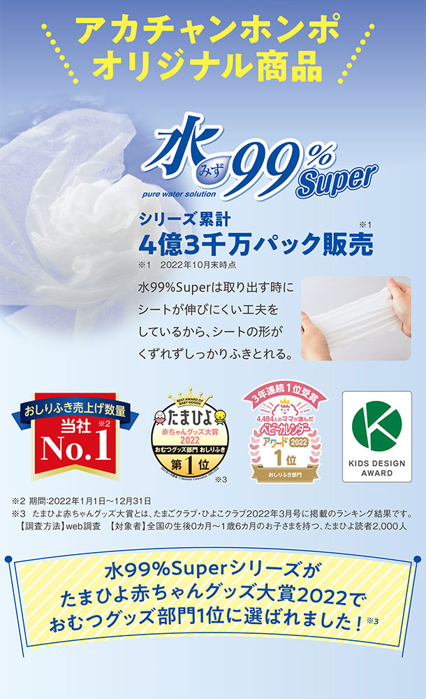 超純水を99%以上使用した、アカチャンホンポで一番売れているオリジナルのおしりふきです。